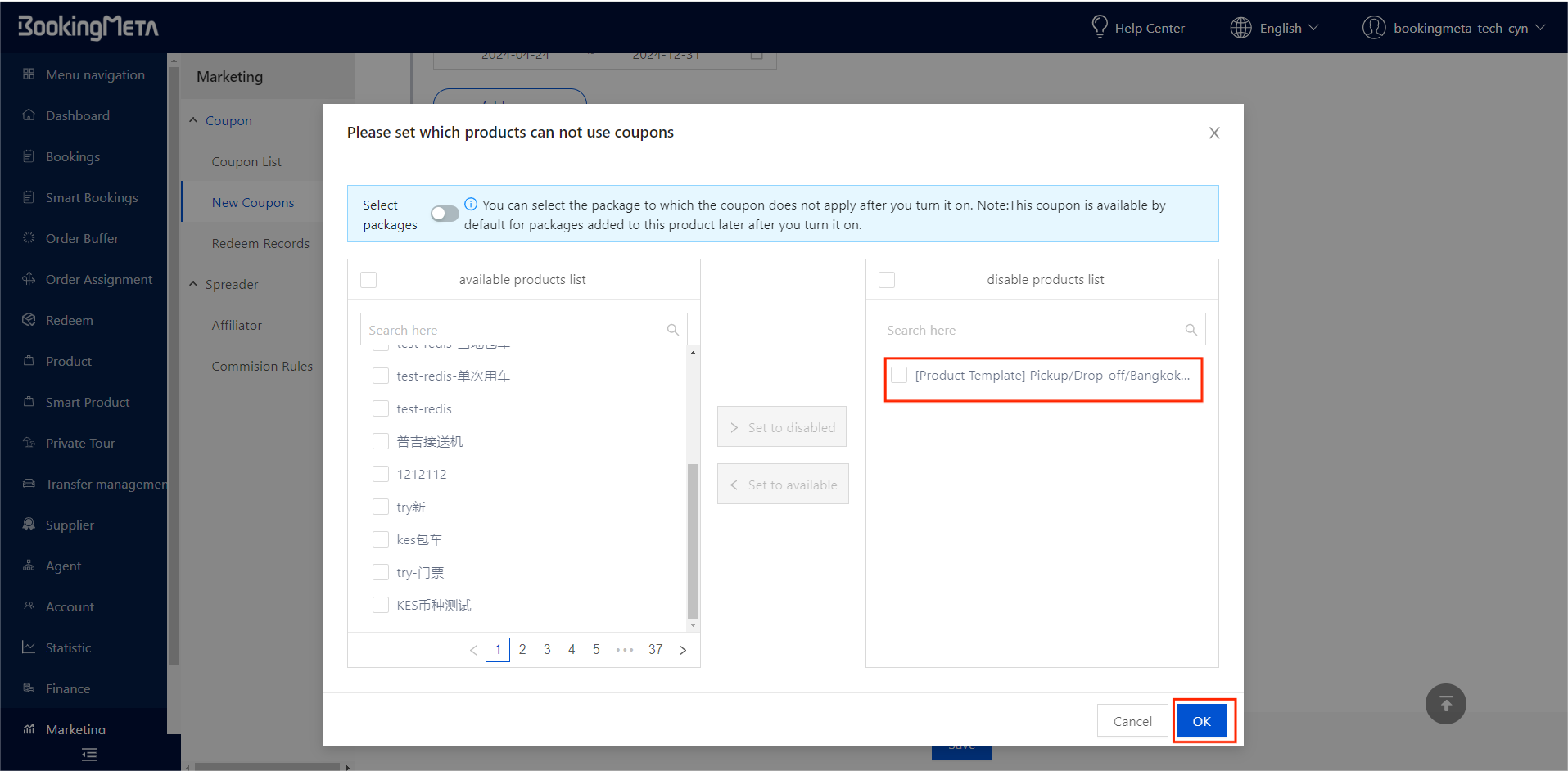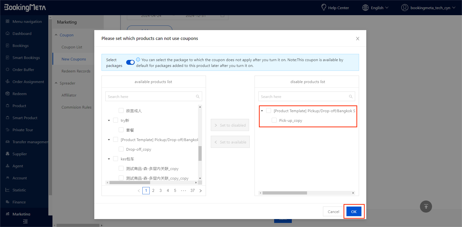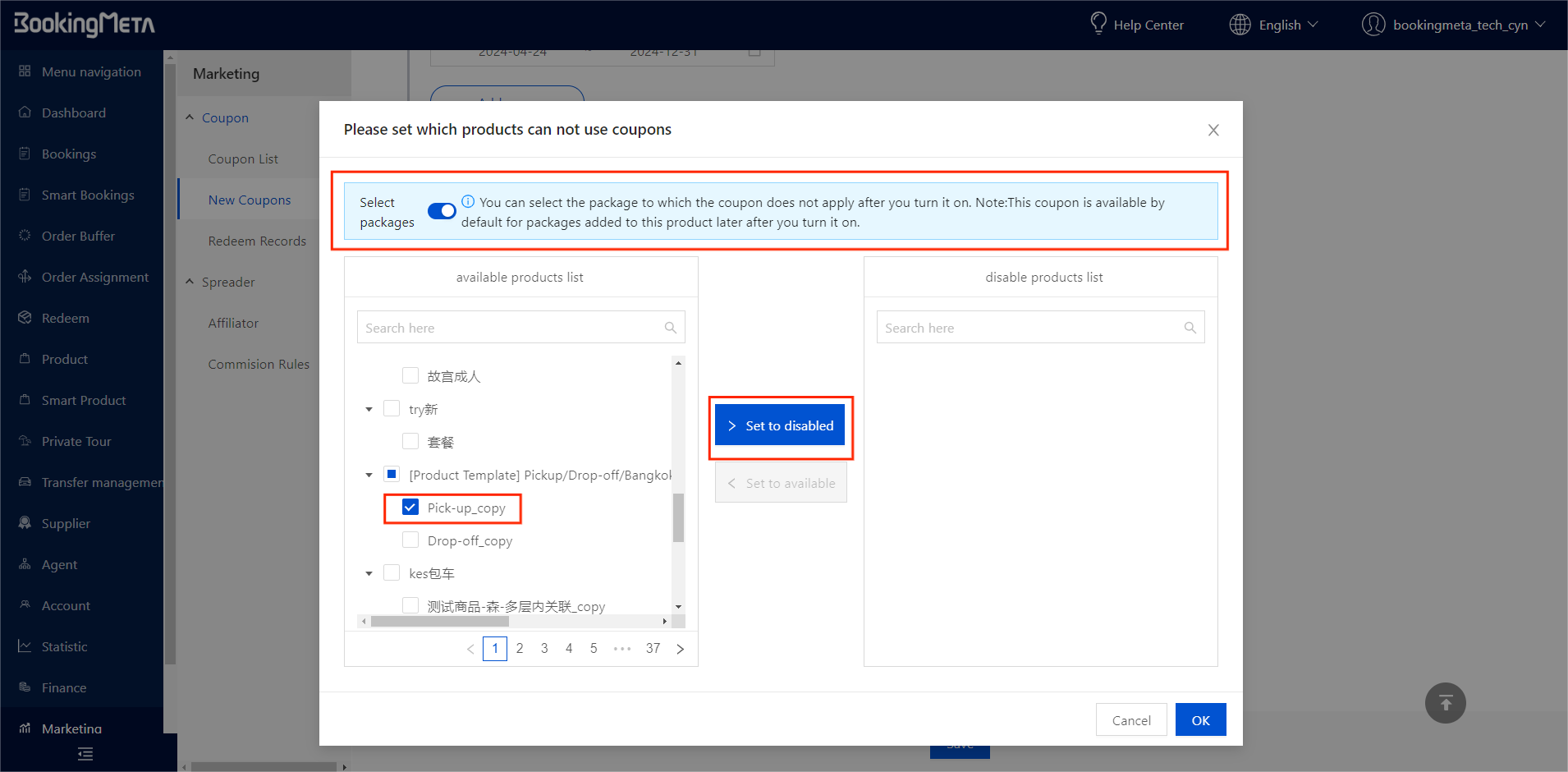Similarly, turn on the switch to further select the packages that is prohibited from coupons. Please note:In this case, if new packages are added to the product subsequently, the new packages will be excluded from the prohibited coupon packages by default.