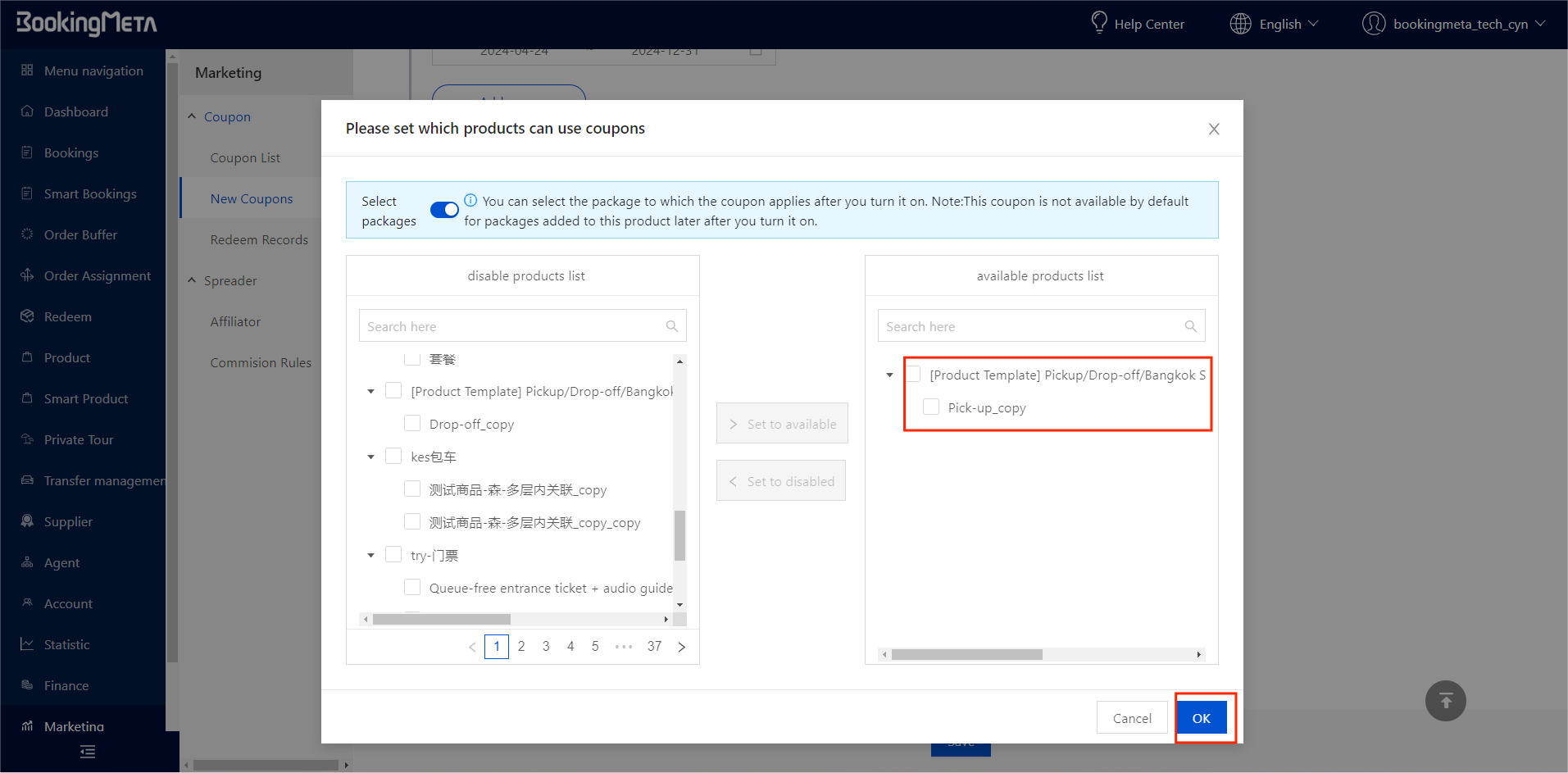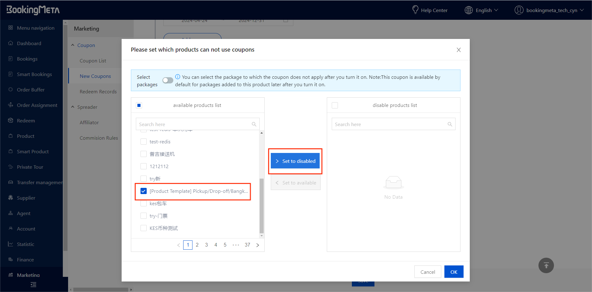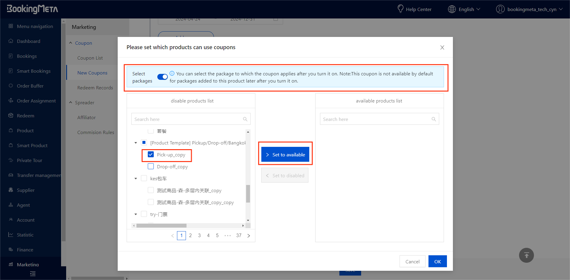 Similarly, turn on the switch to further select the packages that is prohibited from coupons. Please note:In this case, if new packages are added to the product subsequently, the new packages will be excluded from the prohibited coupon packages by default.