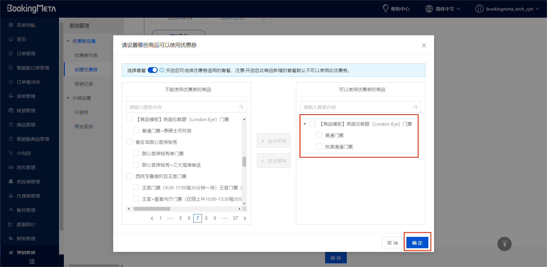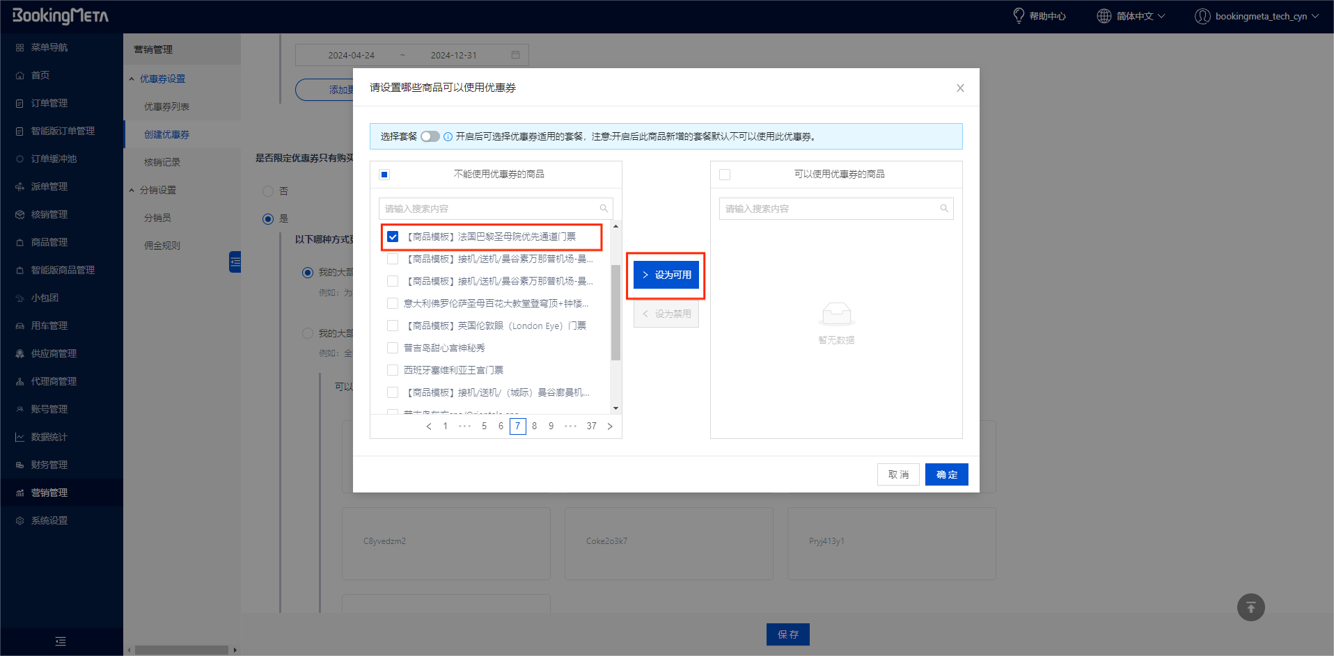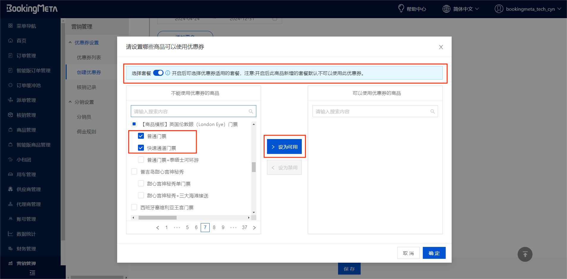 打开开关可进一步选择可以使用优惠券的套餐。请注意:在此情况下,如后续商品中新增套餐,则新增的套餐默认不在可使用优惠券的套餐范围。
