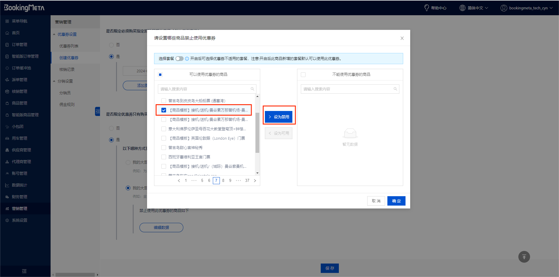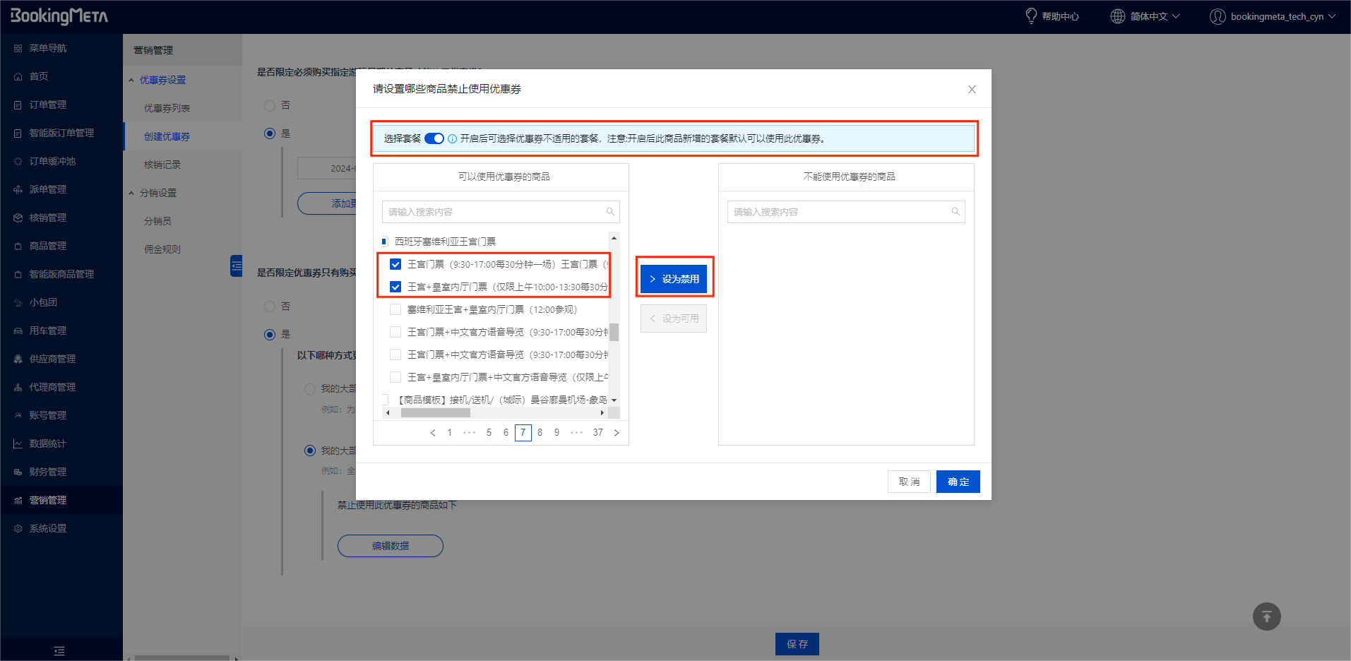 同理,打开开关可进一步选择禁止使用优惠券的套餐。请注意:在此情况下,如后续商品中新增套餐,则新增的套餐默认不在禁止使用优惠券的套餐范围内。