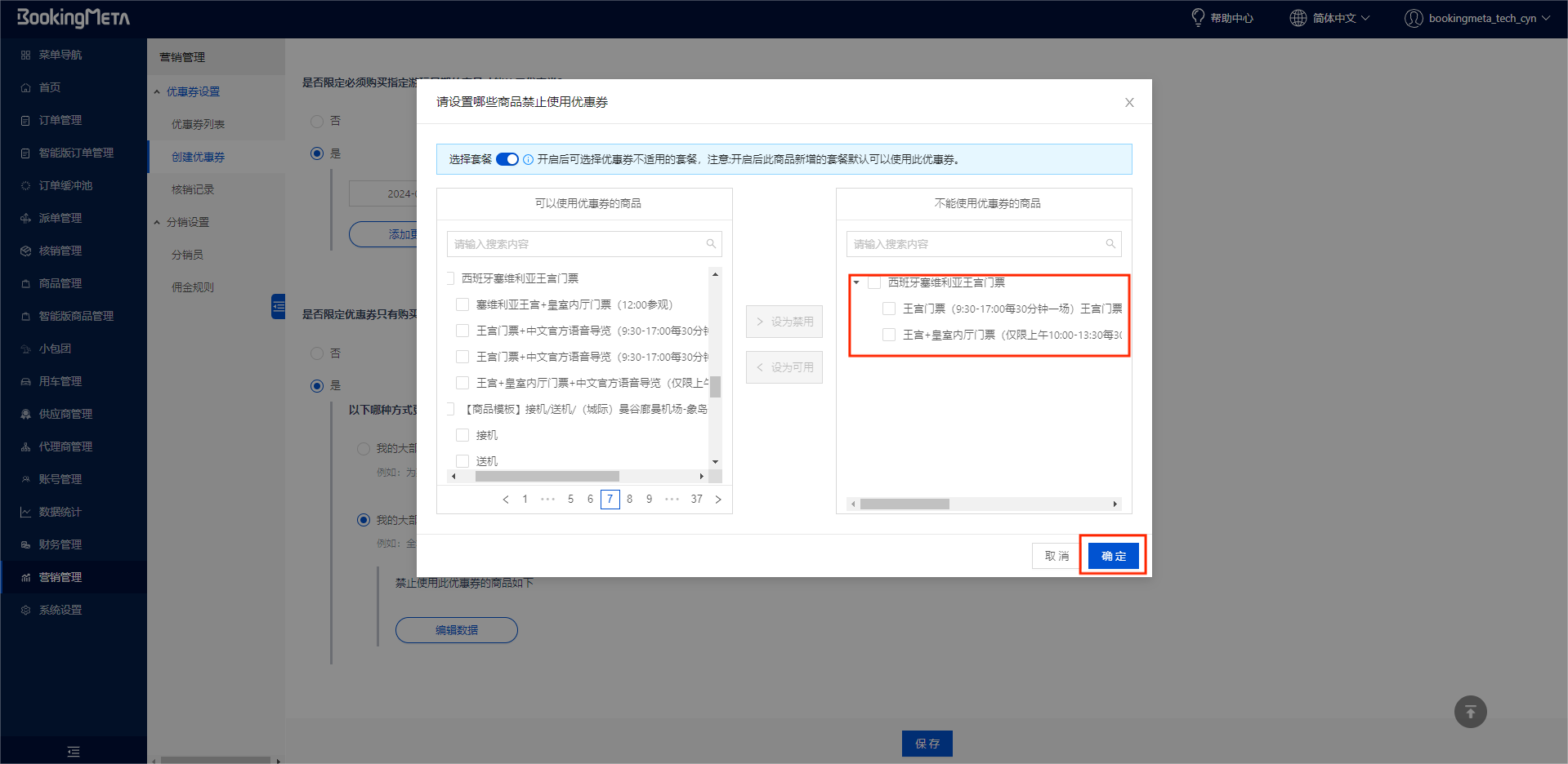 从左侧窗口的全部商品中选出禁止使用优惠券的商品到右侧窗口并确认。