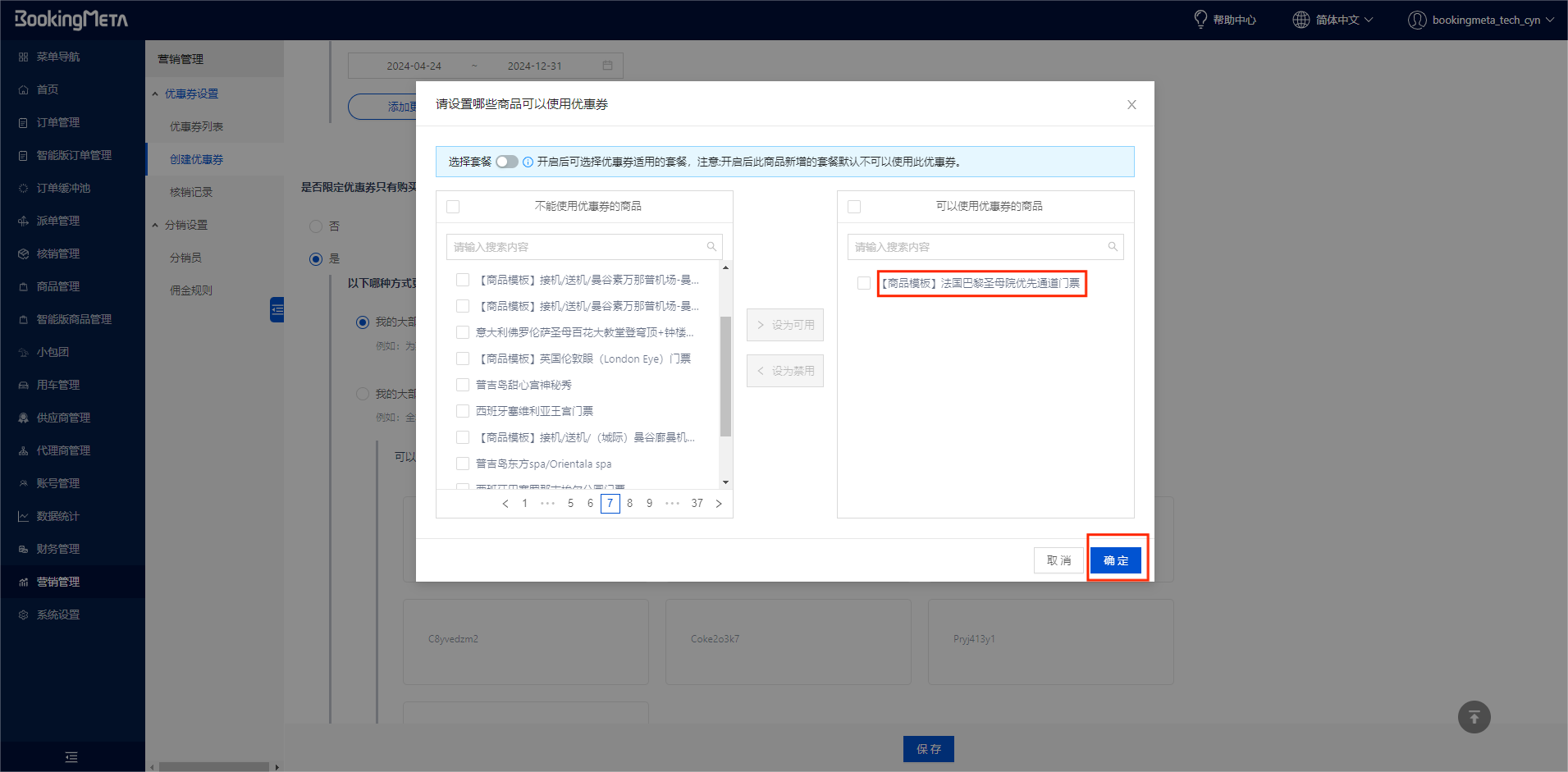 从左侧窗口的全部商品中选出允许使用优惠券的商品到右侧窗口并确认。